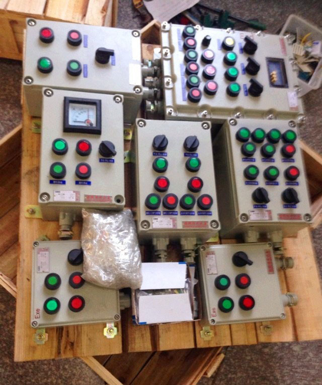 二、防爆控制箱。此類防爆控制箱型號為BXK52系列,其中X是箱體的簡稱,K為控制的縮寫。防爆控制箱主要用于控制各類電機(jī)或者輔助電器,主要由防爆按鈕和防爆指示燈組成。防爆控制箱箱體材料一般分為三種,即鋁合金、鋼板焊接和不銹鋼焊接。防爆控制箱箱體除安裝上述按鈕和指示燈外,還可以根據(jù)客戶要求安裝轉(zhuǎn)換開關(guān)、電流表、電壓表以及制定的各類儀表。